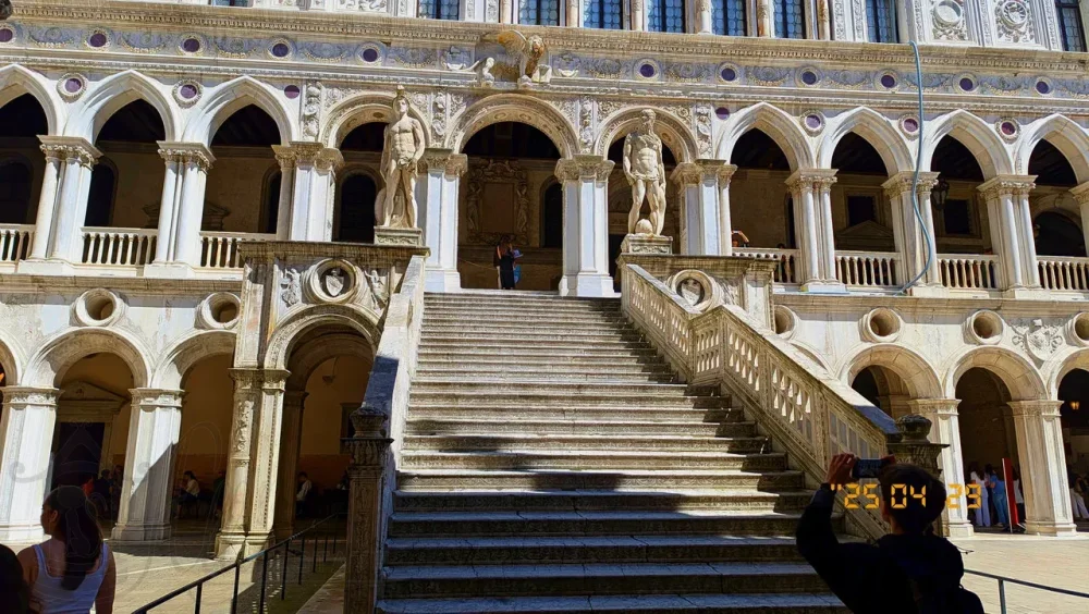 Самое внушительное и ценное сооружение во внутреннем дворе Дворца Дожей Венеции это конечно Лестница Гигантов в стиле эпохи Возрождения. Она расположена левее от места нашего входа и ведет ко второму уровню противоположного восточного крыла дворца, туда, где его опоясывают лоджии.