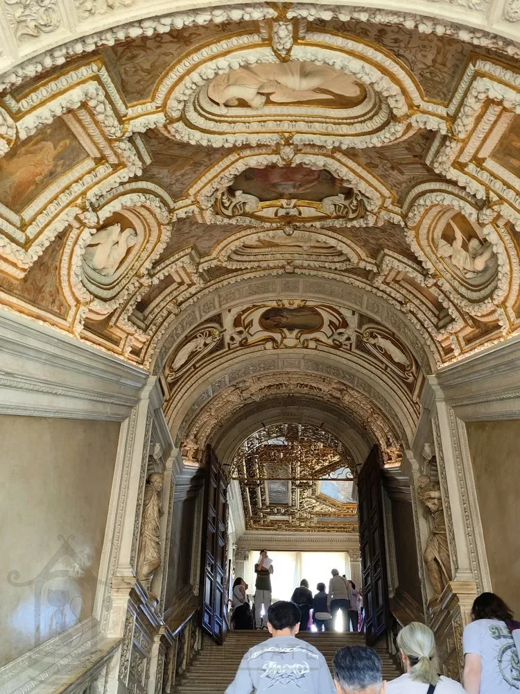 После прогулки по лоджиям поднимаемся сразу на два уровня выше по шикарной Золотой лестнице (Scala d’Oro). Это одно из последних крупных творений во дворце, датируется XVI-м веком.