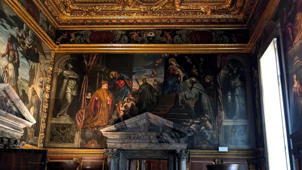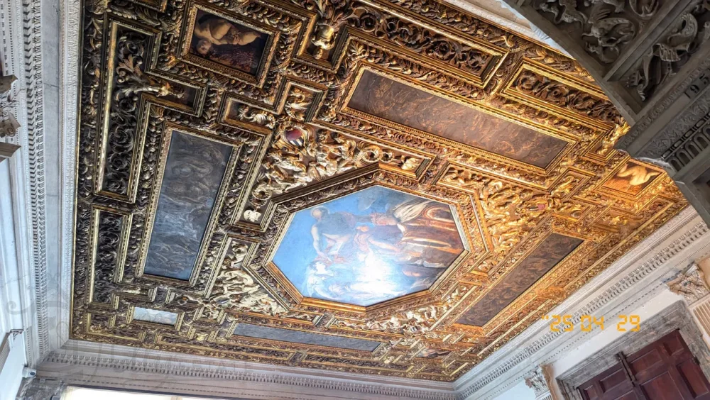 Потолок украшен фресками с мифологическими сюжетами и изображениями городов и регионов, находившихся под венецианским правлением, созданными Тинторетто, начиная с 1578 года.