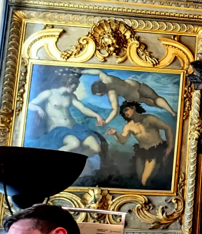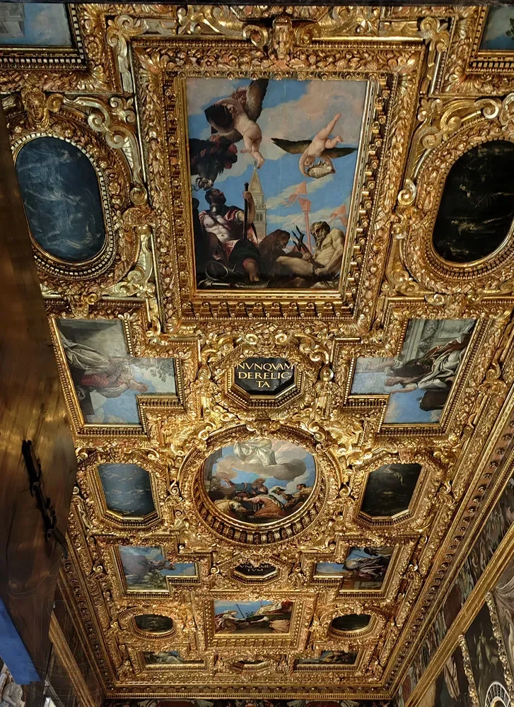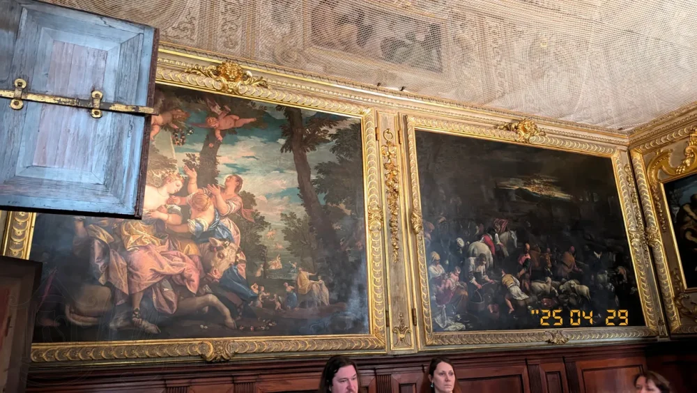 Центральное полотно, украшающее потолок, «Венеция при вручении наград и почестей» принадлежит Паоло Веронезе. Но его, как и драгоценный фриз украшающий верх стен, мы увидели только через натянутую сетку.