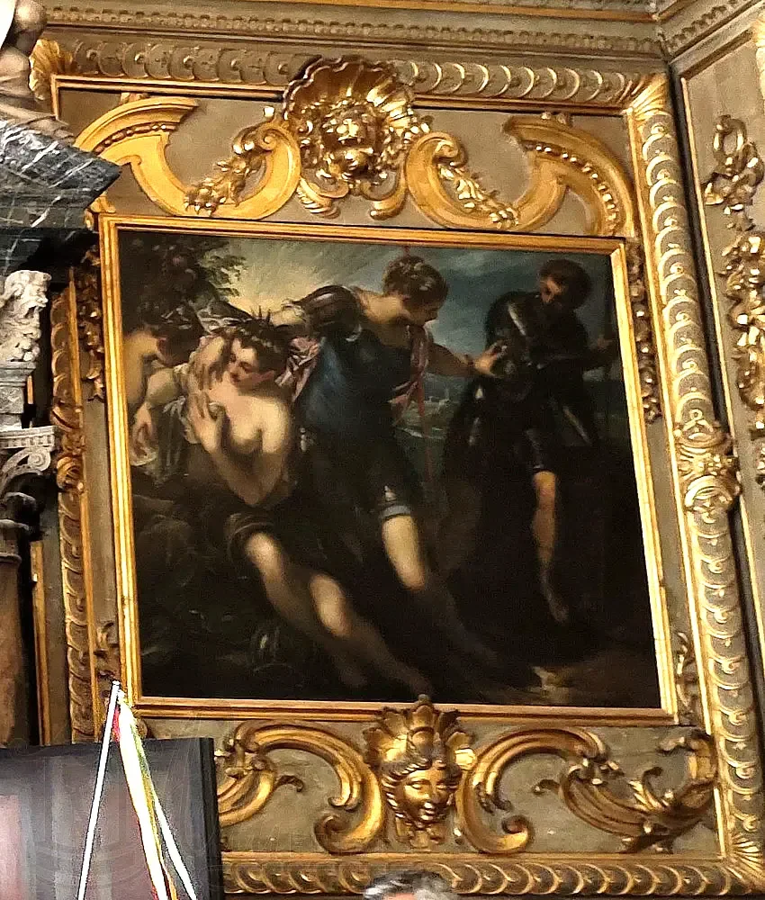 Самые заметные из них руки самого мастера, они по правой стороне - «Дож Николо да Понте взывает к покровительству Девы Марии», 1584 г. и «Мистическое обручение Святой Екатерины», 1576 г. Интересно, что за подобные сюжеты, художнику, в отличии от Веронезе, церковь не предъявляла.