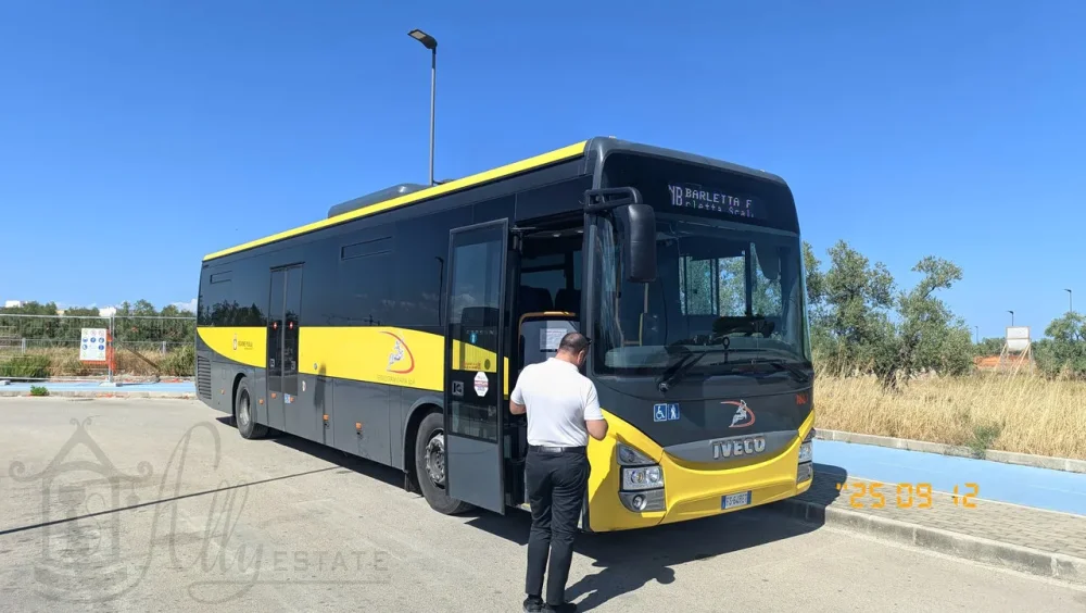 Этот автобус ведёт себя прямо как электричка и привозит вас туда куда привезла бы она сама, будь она на рельсах. В Барлетте автобус останавливается с той стороны ж. д. путей, где проходит улица Via Vittorio Veneto.