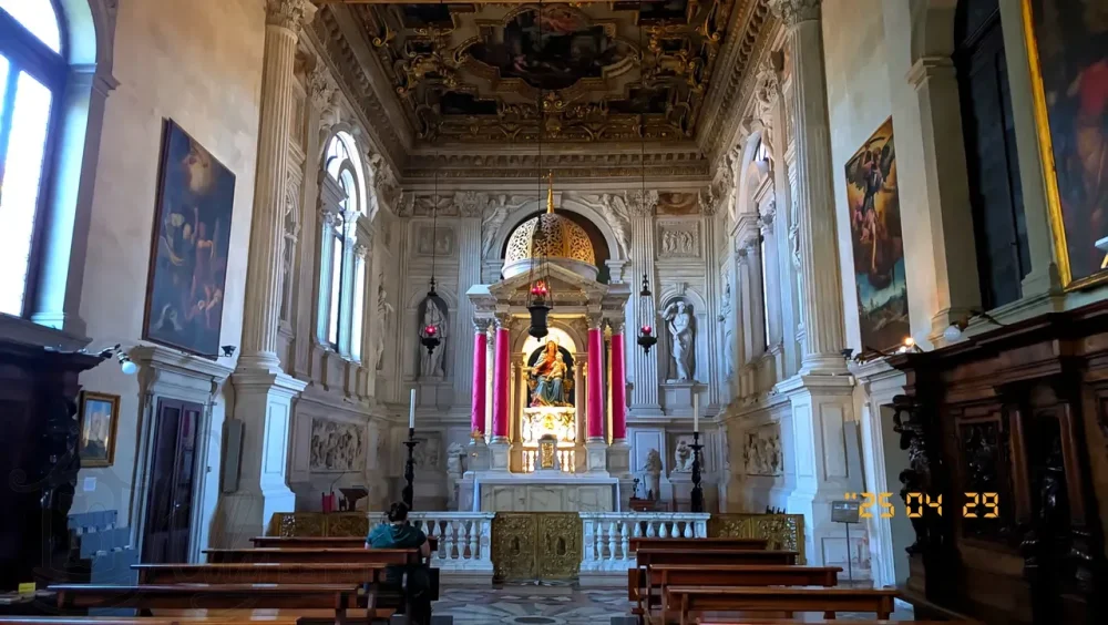 Через красивый портал под часами левого трансепта Базилики Санти-Джованни-э-Паоло проходим в Часовню Розария. Это довольно большое по размерам прямоугольное помещение, заканчивающееся алтарем и квадратным пресвитерием позади него.