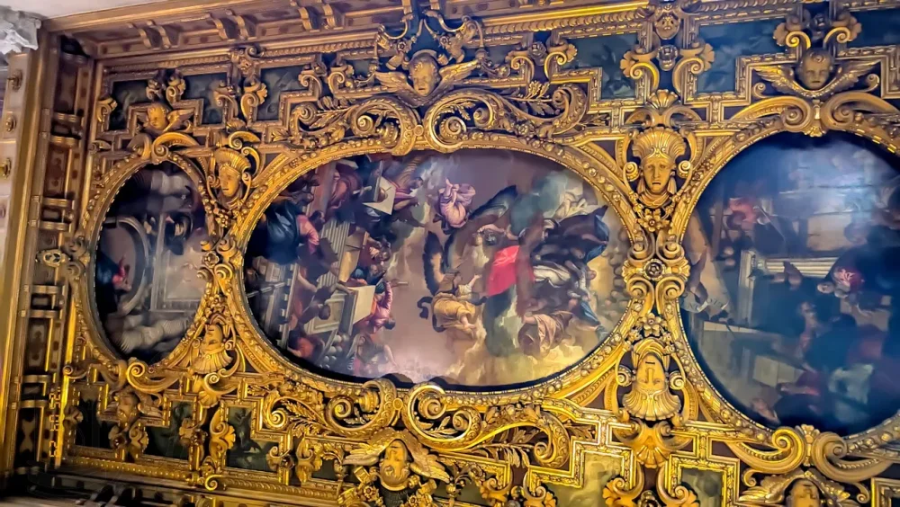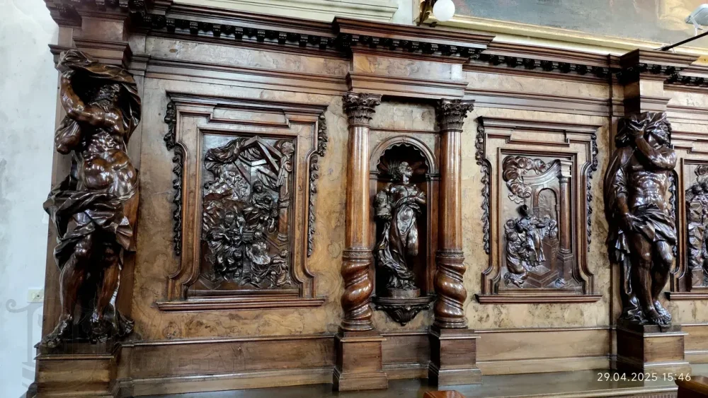 По стенам размещены картины венецианских художников разных периодов и деревянные сиденья с вырезанными на их спинках алтарными картинами, датируемые 1698 годом.