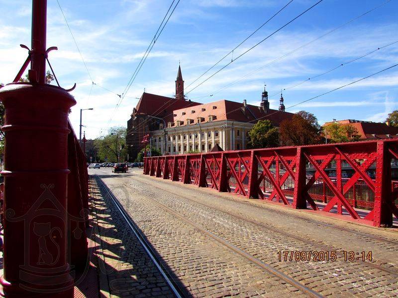 После приятной во всех отношениях водной прогулки, мы вновь вступили на твердь острова Piasek. Отсюда на левый берег Одры, туда где расположен интересующий нас исторический центр Вроцлава, перекинут мост с прозаическим названием Песочный (Most Piaskowy). Его отличительный признак - перила окрашенные в темно красный цвет.