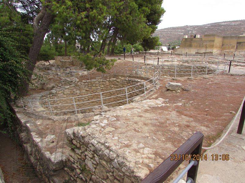 Это один из хорошо сохранившихся и частично восстановленных фрагментов Кносского дворца. Здесь была найдена прекрасная фреска, изображающая праздничную процессию, сейчас она находится в музее Ираклиона, а мы можем полюбоваться копией.