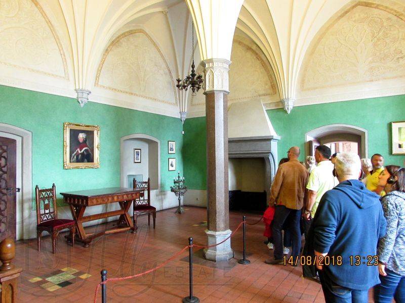 На восточной стене Зимней Трапезной расположены каменный герб Ваза и красочное оформление камина, относящиеся к более поздним, польским временам. В то время, с середины пятнадцатого до второй половины восемнадцатого века дворец служил временной резиденцией польских королей. Во время нашей экскурсии в Зимней Трапезной располагалась выставка старинных ковров или гобеленов.