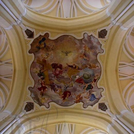 Пересечение основного нефа и трансепта оформлено в виде так называемой česká placka. Не знаю, как это перевести на русский, но по сути это особая форма сопряжения плавных линий купола и сводов над квадратным в плане помещением. Характерный элемент для работ выполненных под руководством Сантини. На куполе фреска с изображением Святой Троицы.