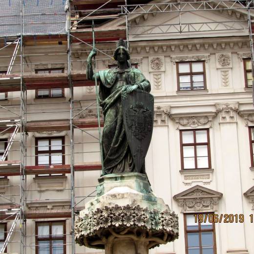 Выше группа из четырех каменных женских фигур – символов четырех главных рек монархии того времени (Дунай, По, Эльба, Висла), расположенная вокруг светлой резной колонны.