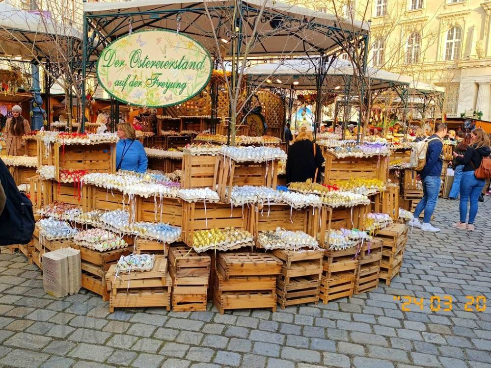 Пасхальный рынок на площади также посвящен пасхальным традициям: здесь мы увидели множество расписных яиц и цветочных композиции, полюбовались на красивые изделия ручной работы и продукты домашнего приготовления.