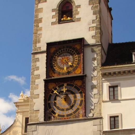 Часы фазы Луны выше являются частью лунного календаря. Еще выше, в готической нише спрятался богемский лев, с помощью специального звукового механизма отпугивающий воров своим мощным рыком в полночь. Впервые упоминается в документе 1564 года.