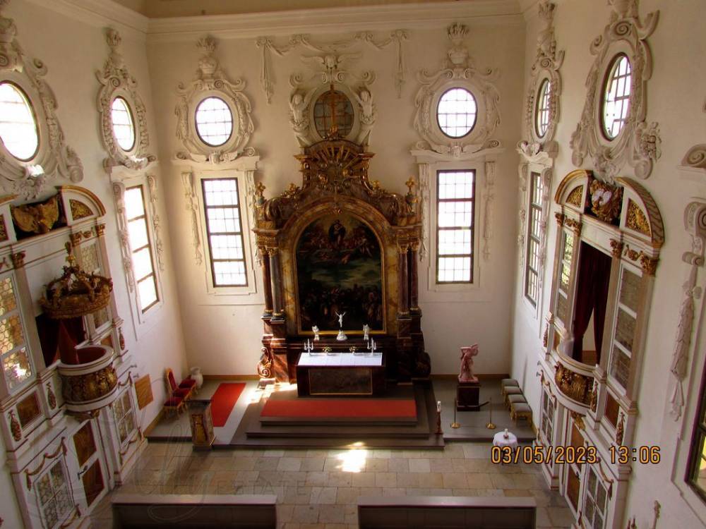 Часовня замка украшена изысканной лепниной и декором из песчаника, потолочной росписью, красивой алтарной конструкцией и королевской ложей.