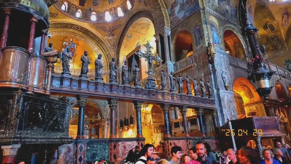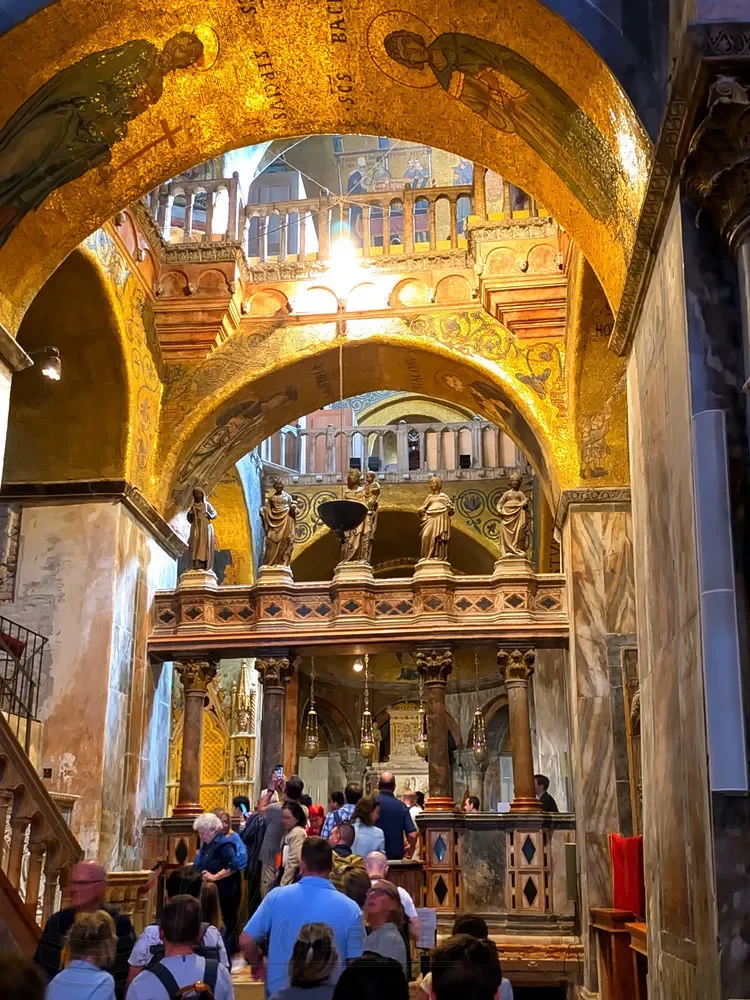 В статье о главном венецианском соборе – Базилике Сан Марко. Побываем внутри, полюбуемся на километры золотой мозаики на стенах и куполах, а также на золотой алтарь Пало де Оро и античных лошадок в музее на верху.