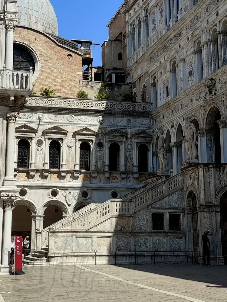 Самое внушительное и ценное сооружение во внутреннем дворе Дворца Дожей Венеции это конечно Лестница Гигантов в стиле эпохи Возрождения. Она расположена левее от места нашего входа и ведет ко второму уровню противоположного восточного крыла дворца, туда, где его опоясывают лоджии.