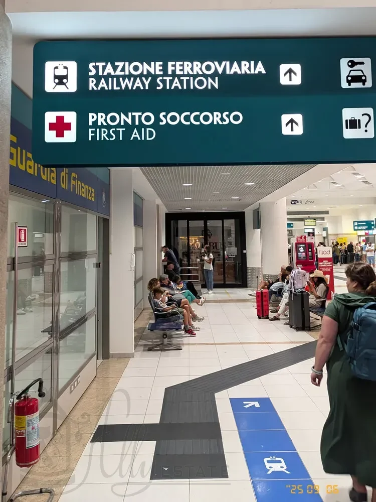 Железнодорожная станция аэропорта Бари расположена отдельно от терминала. Выйдя из зоны прилёта нужно повернуть налево и выйти из здания терминала через выход обозначенный как ж.д.станция.