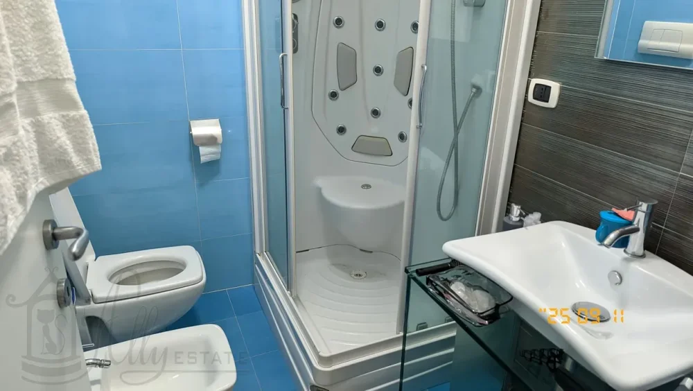 В санузле нашего апартамента все более чем хорошо. Душевая кабина с гидромассажем и без проблем с горячей водой. Удобная раковина со столиком для размещения косметики и подобного. Шампунь и гель для душа прилагаются.