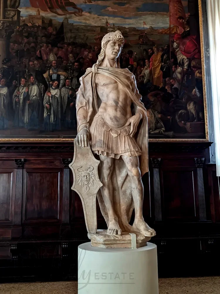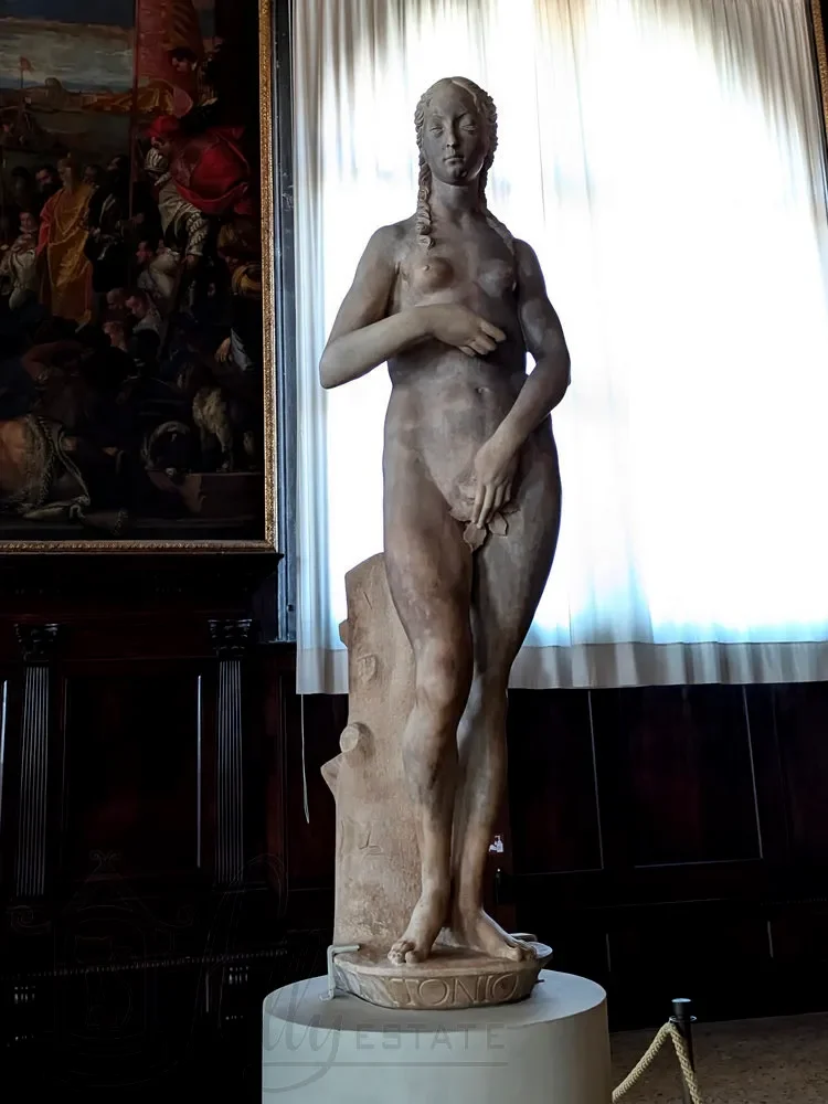 Это мраморные фигуры прародителей Адама, Евы и Воина (также его называют Марсом или Щитоносцем) в полный рост, впечатляющие образцы венецианского искусства эпохи Возрождения.