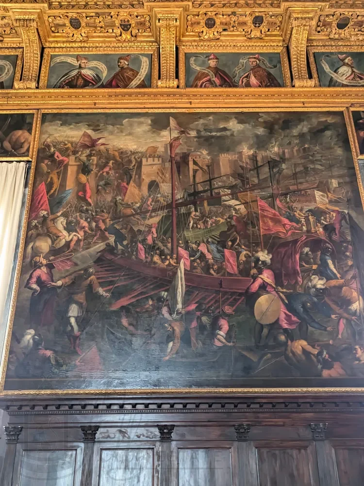 Статья полностью посвящена картинам, размещенным на стенах и потолке Зал Большого совета Дворца Дожей Венеции. Среди авторов Тинторетто, Веронезе, Пальма Младший, Доменико Робусти, Леандро Бассано и другие.