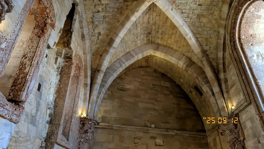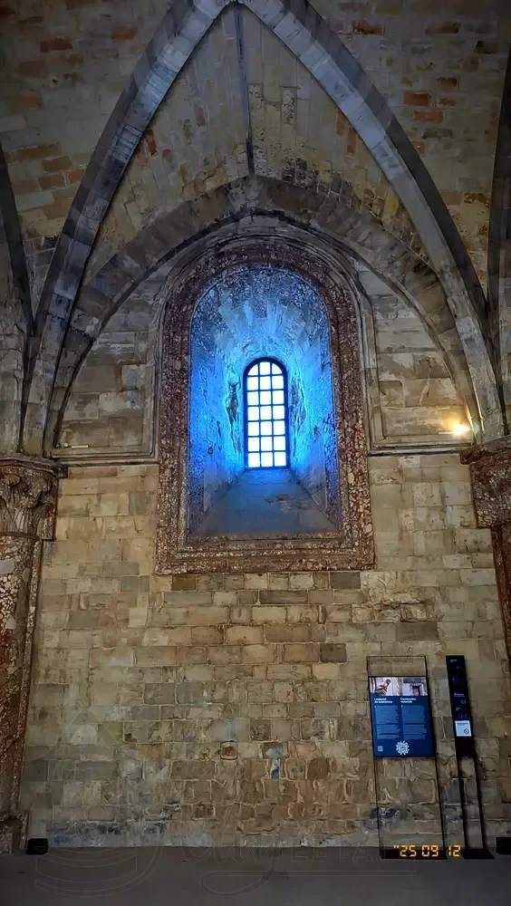Искусно вырезанные ребристые консоли и замковые камни, мозаика в тимпанах окон с переплетами, стены, облицованные плитами из кораллового камня и греческого мрамора, вплоть до опор сводов, подчеркнутые элегантными карнизами.