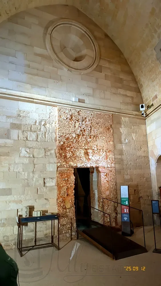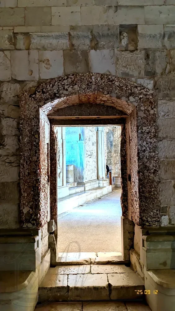 Вокруг коралловой облицовки дверей, соединяющих комнаты первого этажа, более глубокая ниша образует ровную поверхность, облицовка которой была толще, что предполагает наличие инкрустированных плит.