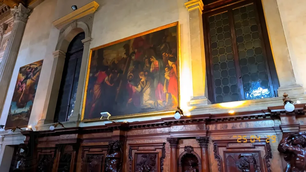 По стенам размещены картины венецианских художников разных периодов и деревянные сиденья с вырезанными на их спинках алтарными картинами, датируемые 1698 годом.