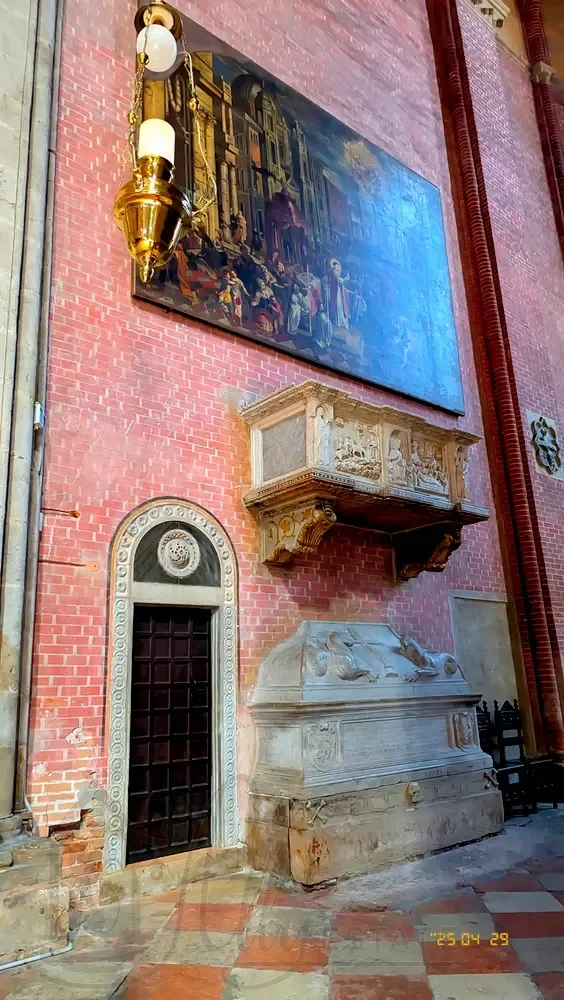Мы в Базилике Санти-Джованни-э-Паоло и уже осмотрели ее контрфасад с памятниками дожам из семьи Мочениго. Двигаясь далее по часовой стрелке, прошли вдоль левой стены базилики со множеством памятников выдающимся венецианцам.055