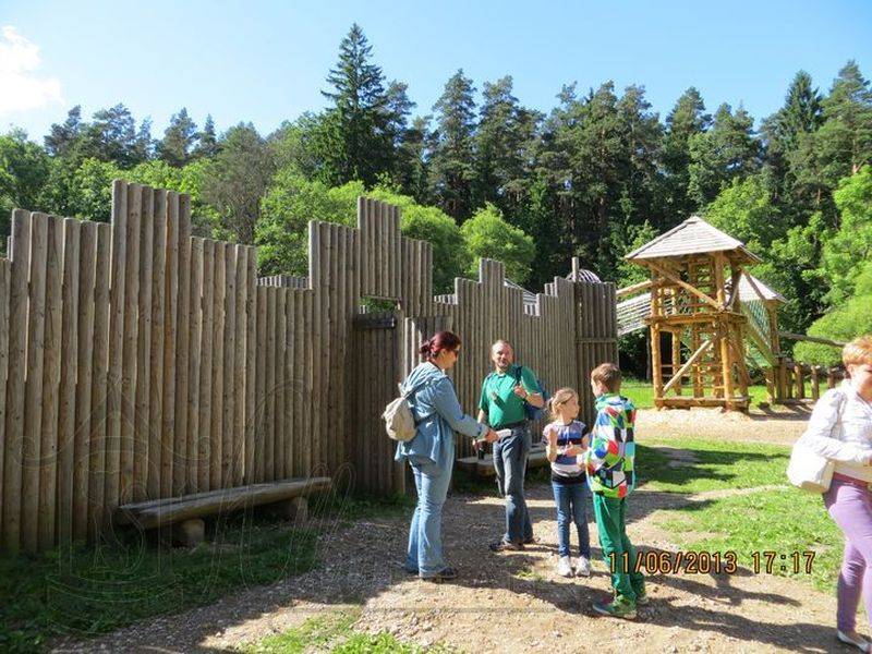 На Игровой площадке Природного парка Тервете можно выделить как минимум три интересных и больших объекта. Это Лабиринт, стены которого сделаны из толстых бревен и вид у него как у старинного палисада за частоколом бревен. Лабиринт в принципе не сложный, поворотов и тупиков конечно немало, но проходится быстро.