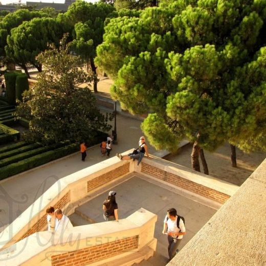 Всю обширную территорию площади Испании в Мадриде занимает пешеходная зона, где пешеходные дорожки перемежаются с зелеными газонами и цветочными клумбами, есть и деревья.