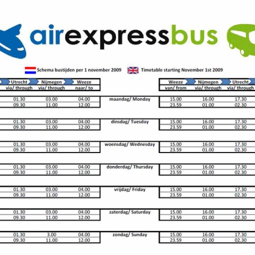 Перевозки по автобусному маршруту => Utrecht => Nijmegen => Amsterdam организованны компанией Airexpressbus, на сайте которой www.airexpressbus.com Вы найдете полную информацию об этом маршруте, а также о маршрутах в другие города Нидерландов.